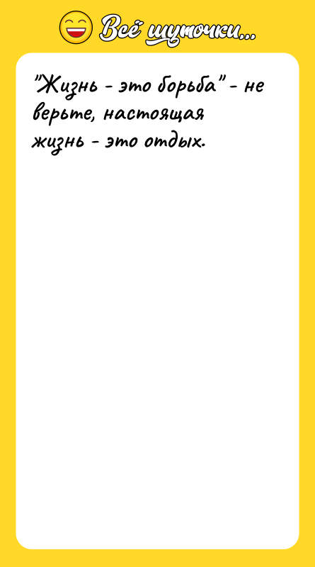 Анекдот иронизирует над распространённым мнением о том, что жизнь — это постоянная борьба, утверждая, что на самом деле она заключается в отдыхе.