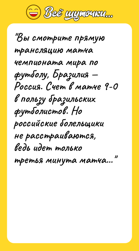 В анекдоте описан матч чемпионата мира по футболу между Бразилией и Россией.